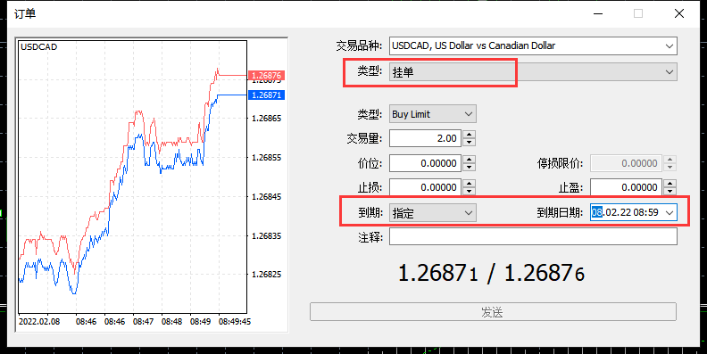 第二步:双击品种,选择挂单,之后大点击如图标记的地方,选择时间就可以了。最后选择交易就可以了。