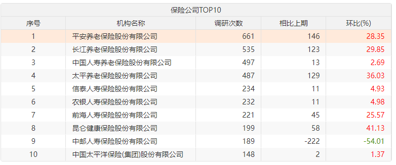 保险公司中,承担企业年金及职业年金投资管理人角色的平安养老、长江养老等几家养老保险公司的上市公司调研次数居前,一年内均超过400次,信泰人寿、农银人寿、前海人寿调研次数也均超过200次。