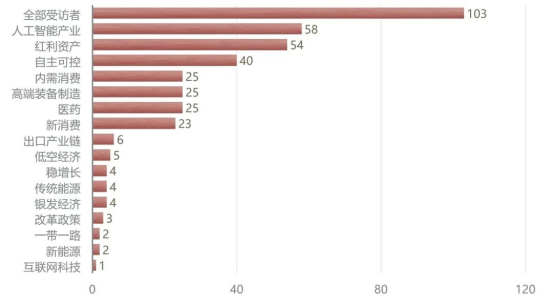 中国保险资产管理业协会8月末发布的《“资产管理百人问卷”调查报告(第8期)》亦显示,对于下半年投资收益率表现最好的境内资产的判断,受访资管人士选择的前三位分别是黄金、A股、利率债,占比分别为72%、69%与31%。在对下半年权益市场最看好的主题的判断中,选择最多的六个主题为:人工智能产业、红利资产、自主可控、内需消费、高端装备制造和医药。