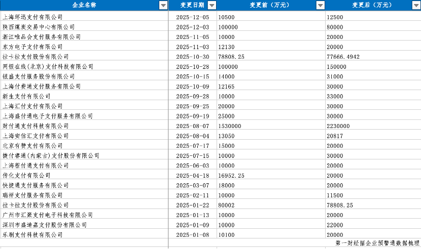 监管压力迅速转化为市场的增资浪潮。第一财经记者据企业预警通统计,仅2025年已有20余家支付公司获批增资。