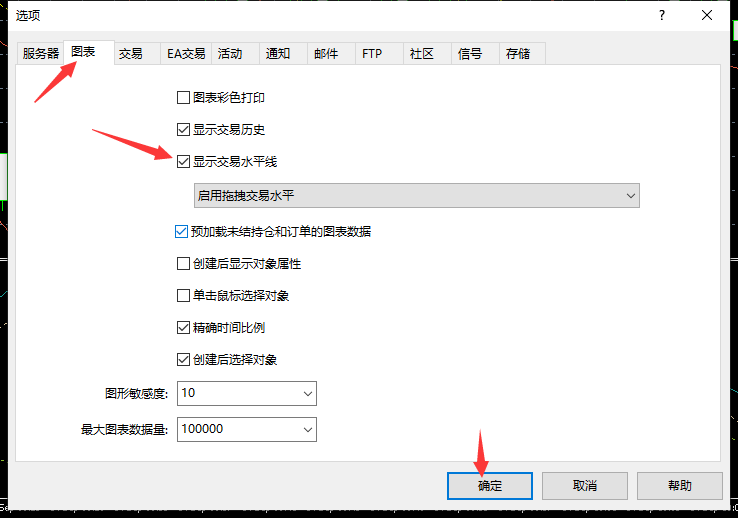 第二步:选择图表,点击显示交易水平线,最后点击确定就可以了。